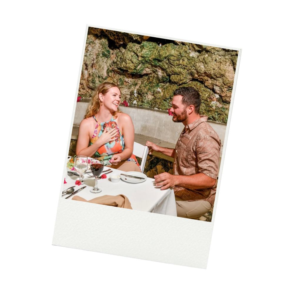 At our private dinner in the oceanside caves beneath the resort, a photographer came by to take some “complementary photos” and the waiter brought down our coconut shrimp - except there was no shrimp on the plate, just a ring box!
